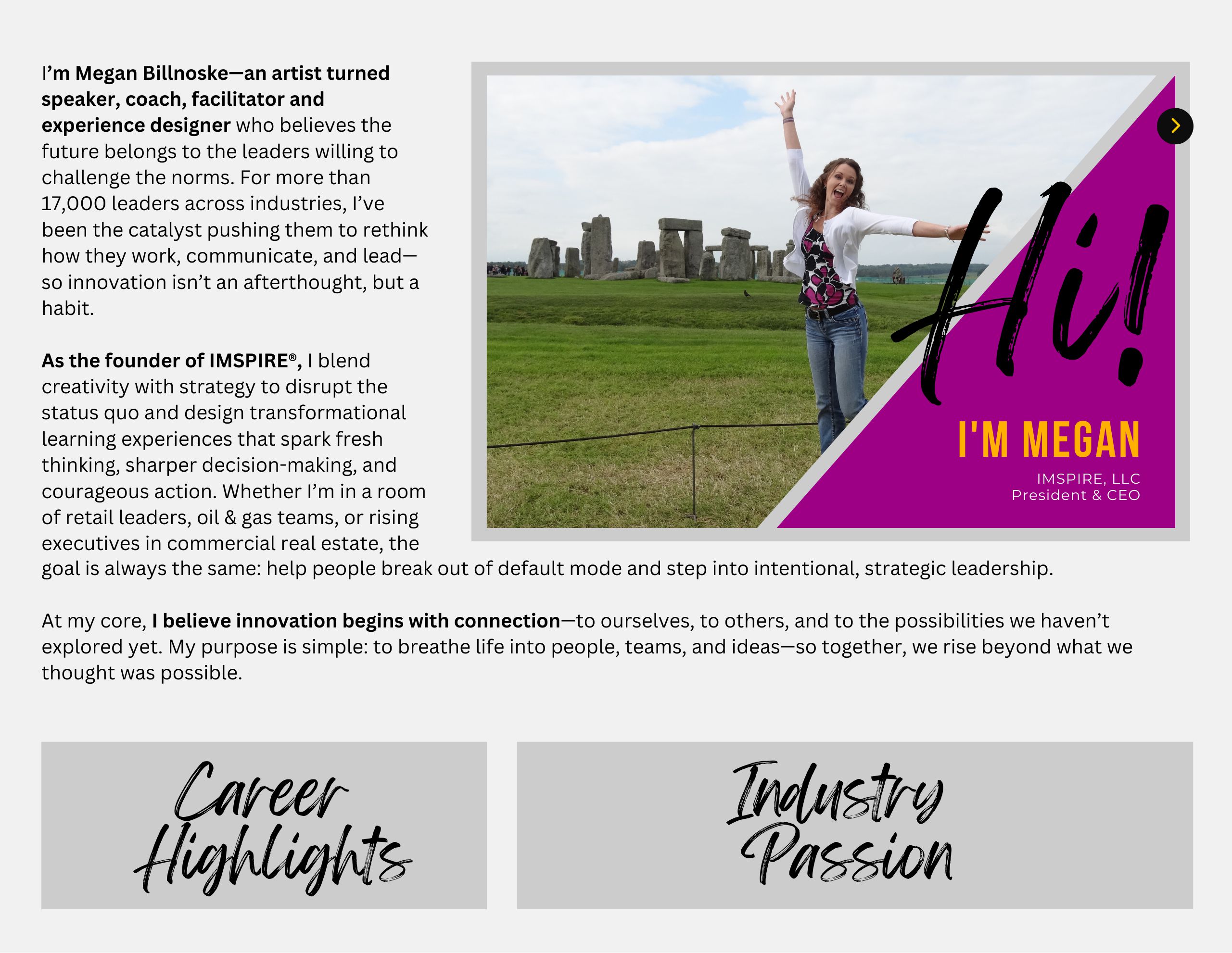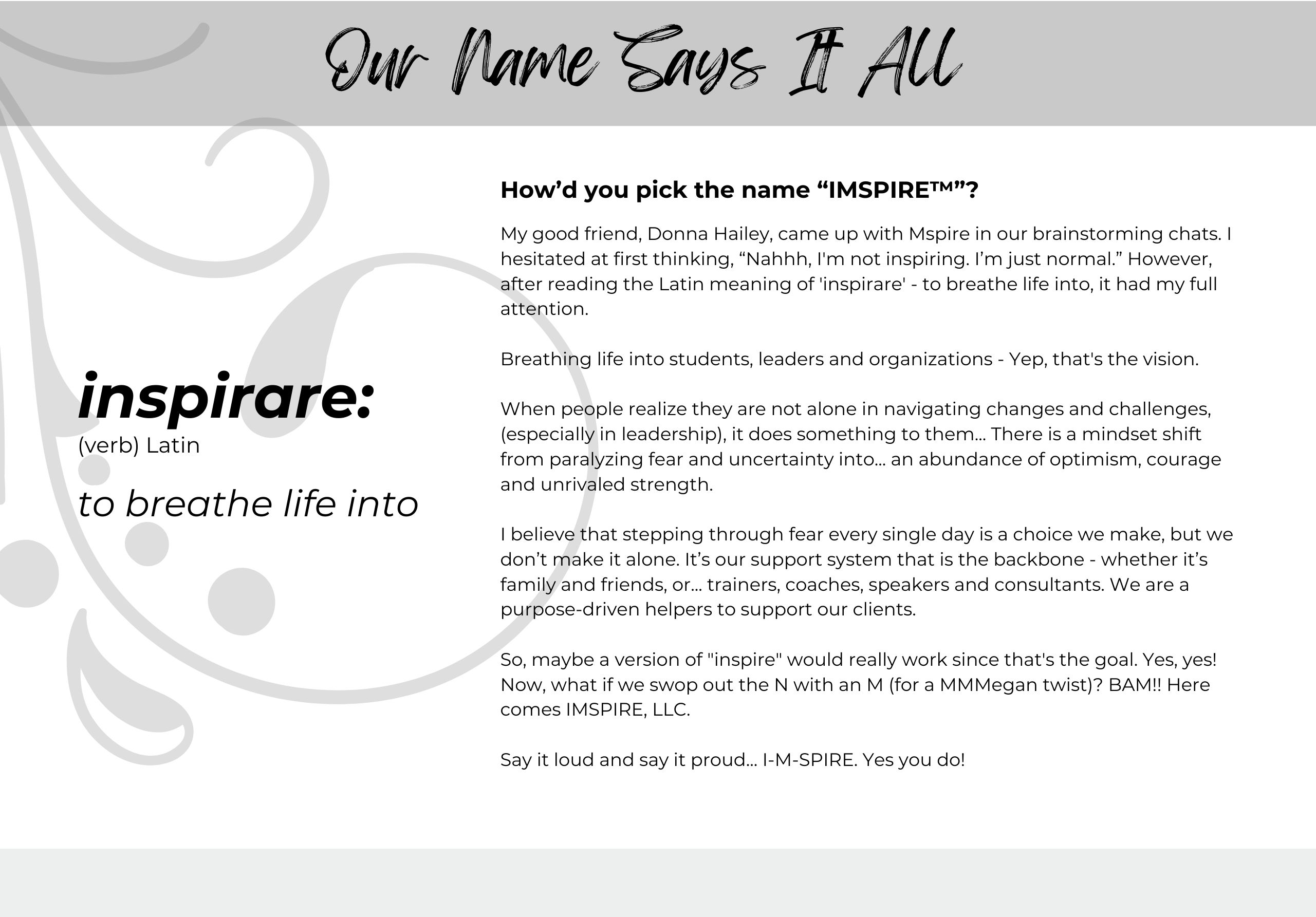 DDI, Ken Blanchard Companies, FranklinCovey and Langevin, it just makes sense. I’m at a place in life where I can offer much experience and guidance to clients beyond just working for one employer. So, IMSPIRE specializes in diverse, well-rounded best practices, and top industry support from the learning and development industry. My story continues in my new IMSPIRE chapter, and I’m living it now! Although, I couldn’t have lived My Story thus far without my husband, family, mentors and friends who listened, laughed, cried and cheered me along the way. So, thank you for being there! Are you ready? Schedule a free consultation today, and start conversation.