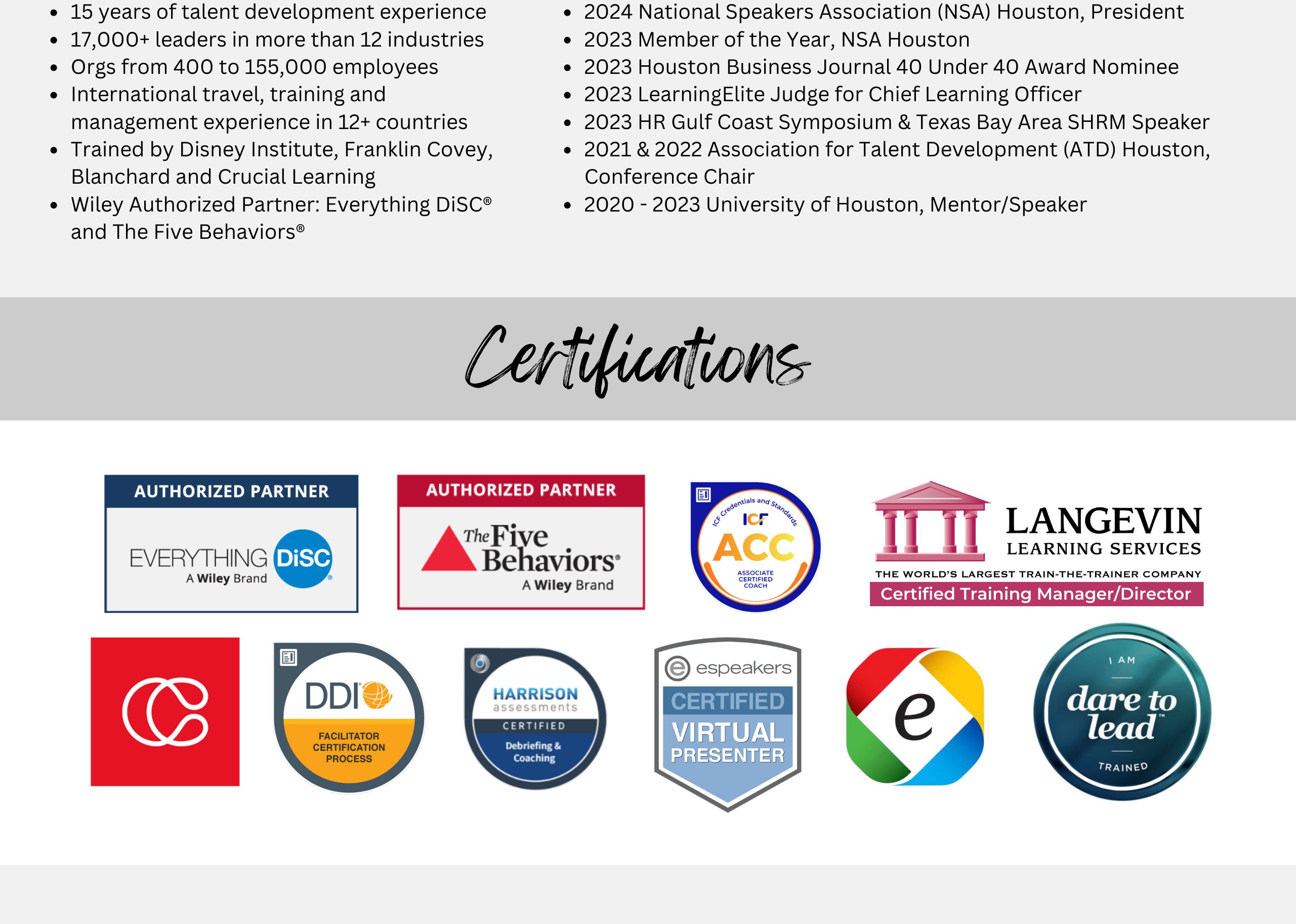 Maybe you need a workshop facilitated, so it has the most effective output. Or perhaps you'd like to celebrate on-time launches resulting from clear, accountable and low stress project management - I love doing those! What about speaking or access to the top tools in the industry for leadership and career development (Everything DiSC, The 5 Behaviors of a Cohesive Team and Situational Leadership II)? None of these? Well, how about 1:1 mentoring or coaching? You guessed it - it's all in my wheelhouse, and I love what I do. Career Highlights. 12 years of professional training and development in the corporate world with students, interns, individual contributors, frontline managers, mid-level leaders, senior leaders and executives, Trained 11,000+ leaders in more than 10 industries, Developed and delivered 12+ training programs (onboarding, leadership, technical and more) in 10 years, International travel, training and management experience in 12+ countries. Industry Passion, 2023 Houston Business Journal 40 Under 40 Award Nominee. 2023 LearningElite Judge for Chief Learning Officer. 2023 National Speakers Association (NSA) Houston, Board Member. 2023 HR Gulf Coast Symposium & Texas Bay Area SHRM Speaker. 2021 & 2022 Association for Talent Development (ATD) Houston, Conference Chair, current member, former Director of Outreach. 2020 - 2023 Mentor and Speaker for University of Houston HR students and several other universities. Certifications. Certified Practitioner. Everything DiSC. Langevin Learning Services. Certified Training Manager/Director. eSpeakers Certified Virtual Presenter. I am Dare to Lead Trained, e-Colors, DDI facilitator certification process. A purpose driven business.