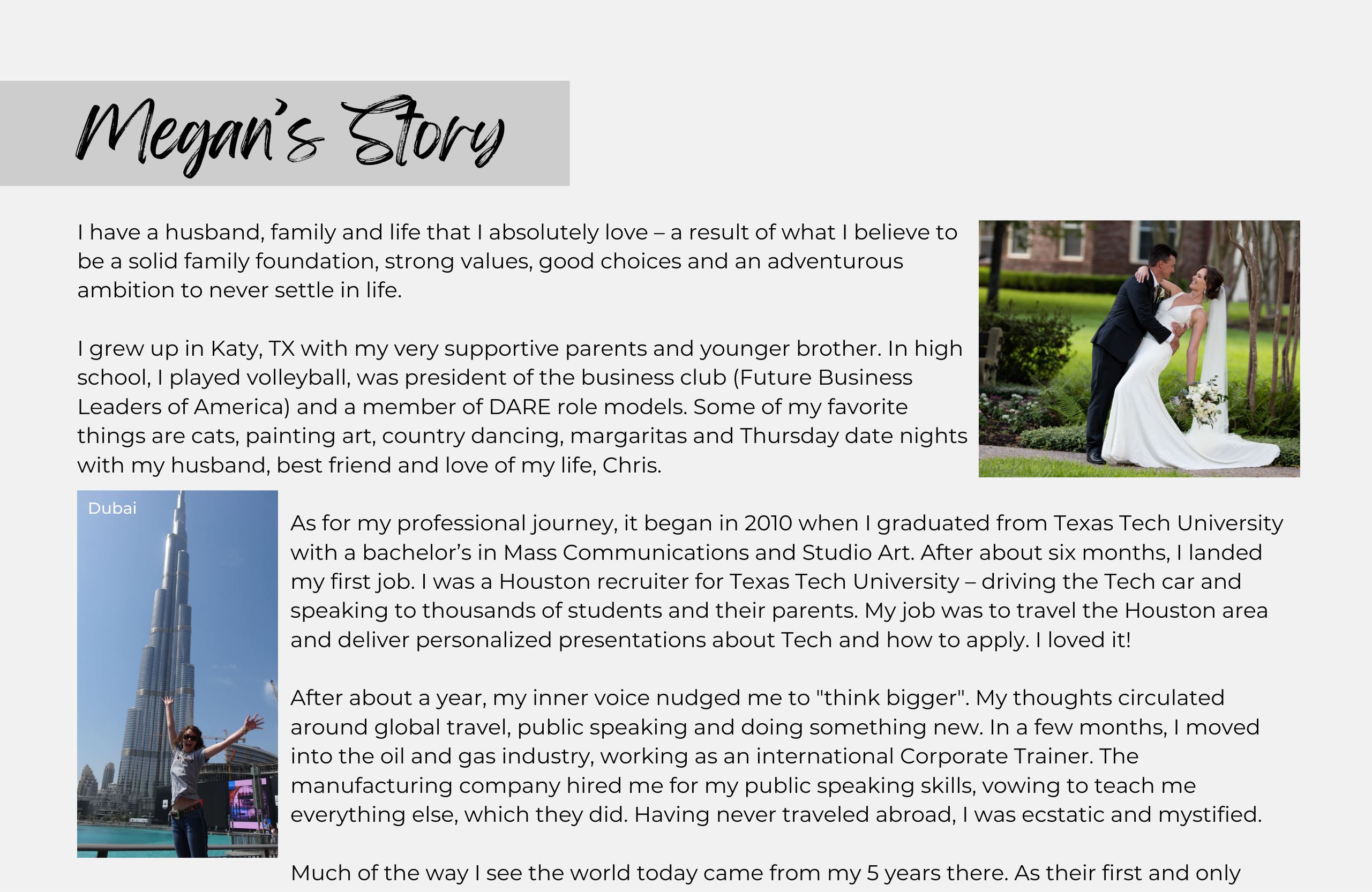 with my husband, best friend and love of my life, Chris. As for my professional journey, it began in 2010 when I graduated from Texas Tech University with a bachelor’s in Mass Communications and Studio Art. After about six months, I landed my first job. I was a Houston recruiter for Texas Tech University – driving the Tech car and speaking to thousands of students and their parents. My job was to travel the Houston area and deliver personalized presentations about Tech and how to apply. I loved it!