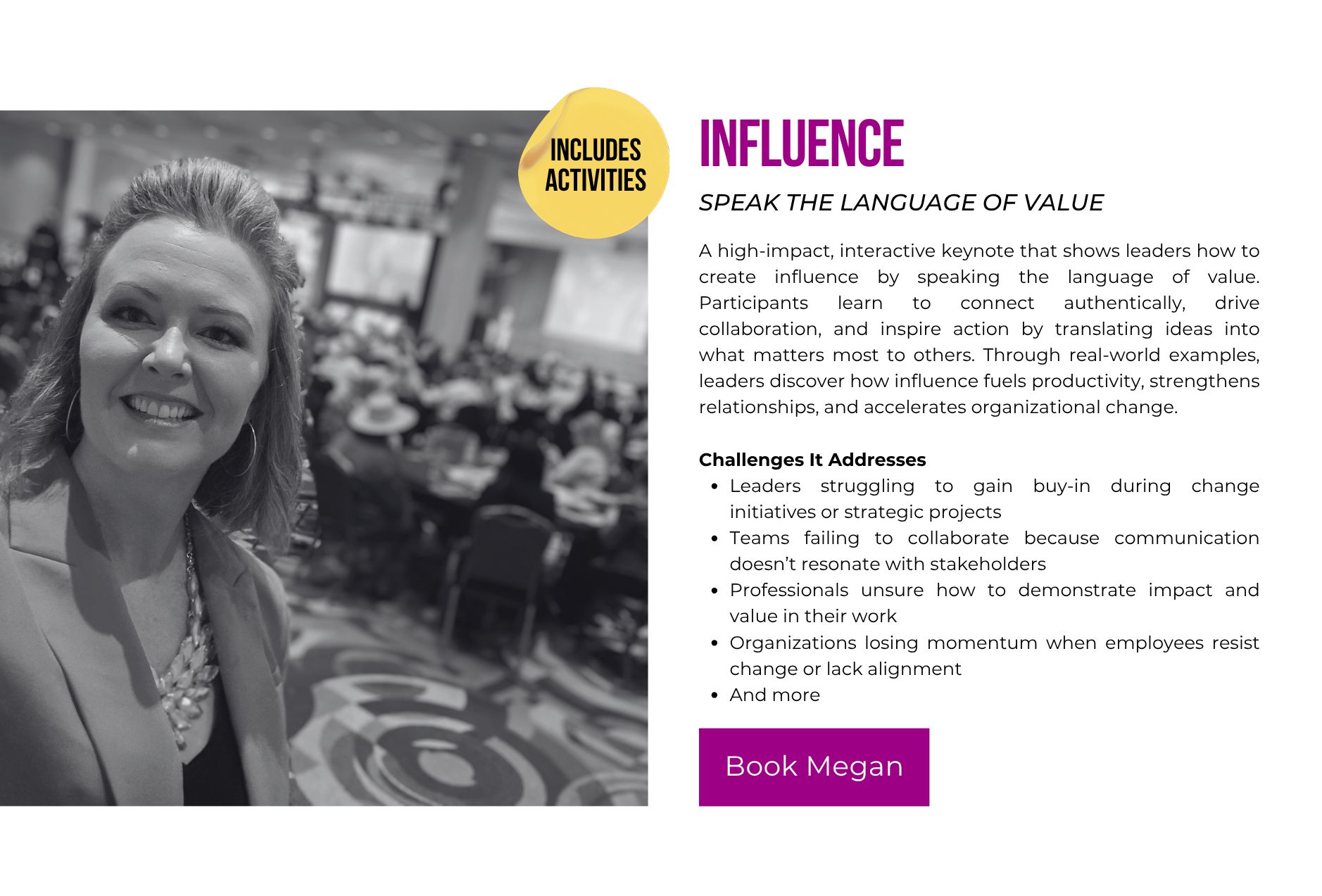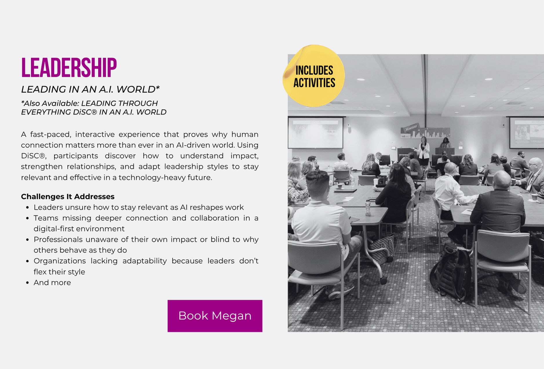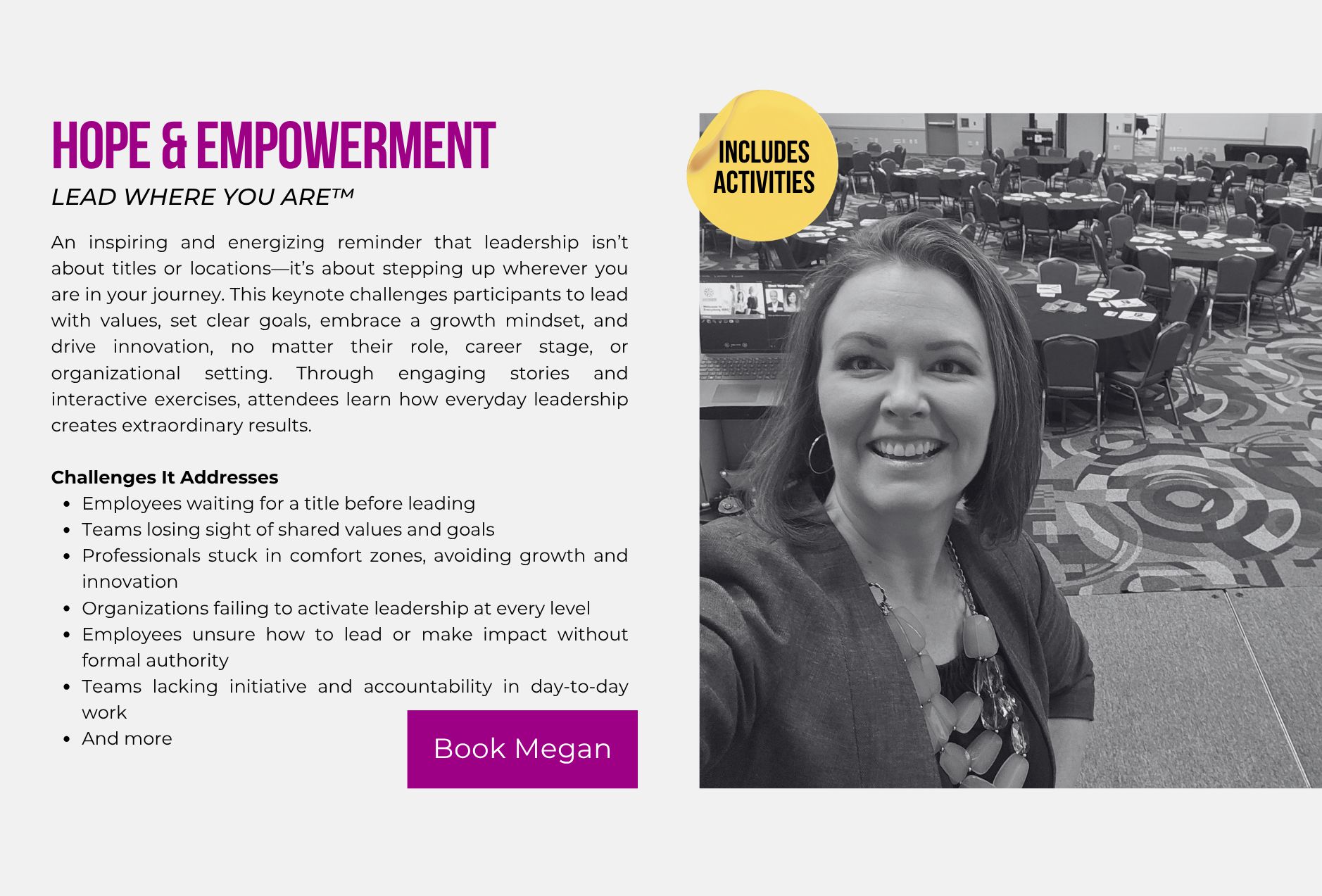 Imspiring Leaders Teams Students from 3 different platforms. Serving as a Dynamic Resource. Training Development & Design, Project Management, Coaching & Career Mentoring, Facilitation. Speaking. Events, Conferences Universities Monthly Meetings. Consulting. Everything. A few things. Just one thing (full list provided). Development and Design Training Experiences Experience a full-service training and development solution all in one place - everything from individual training sessions, to full comprehensive training programs. Meet your organization's needs for leaders, teams and students with ease and flexibility. Goal. What problem are we solving for? Topic, what concentration helps us reach your goal? Delivery, what method creates an experience for the topic? Alignment, Attrition, Career Growth, Communication, Conflict, Customer Service, Delegation, Engagement, Influence, Leadership, Networking, Performance & Productivity, Public Speaking, Sales, Self-Awareness, Trust, And more! Everything DiSC (Wiley), Development Programs, Students, Interns, Leaders, Managers, Non-Manager Titles (Supervisors, Team Leads and High Potentials), Teams, International Business, LinkedIn, Situational Leadership II (SL II) by Blanchard, Team Retreats/Workshops, The 5 Behaviors of a Cohesive Team (Wiley), Aha Slides, Amazing Race Style, Breakout Groups, Competitions, Debriefs, Electronic Note Forms, Field Trips, Flip Chart Activities, Gallery Walks, Guest Speakers, Presentations, Scavenger Hunts, Table Trivia, Visual Aids, Whiteboards (virtual). Popular programs. Everything DiSC - Assessments, Wiley Certification Program & Training Programs. Leadership Training. Situational Leadership II (SL II) - Assessment, Blanchard Certifications and Training Programs. The 5 Behaviors of a Cohesive Team - Assessment & Training Program. Project Management Celebrate on-time GO LIVE launches and professionally run Learning & Development projects from start to finish - clean communication, role clarity, team accountability, delegation and weekly report-outs to keep it simple and low stress. Coaching & Career Mentoring. From 1:1 training to select guidance, you expand your career at any level, whether a student, professional or looking for a change in careers. Access top industry tools to discover your best next steps and understand how to continue your journey. Facilitation. Enjoy well-facilitated meetings, workshops and training events, so they run smoothly and have the most effective output and use of time. Speaking Personal stories, humor and experiences from around the world will provide a new perspective for you to go make a change in your life, think about things differently or inspire someone else. Resilience. Servant Leadership. Yes, You Can! Be Different. Never Settle. View Videos. Consulting. All Things L&D. Contact megan. Houston Business Journal 40 Under 40 Award 2023 nominee. Help with everything? Help with a few things? Or, just help with 1 thing? A resource buffet. NEEDS ANALYSIS & NEXT STEPS FOCUS GROUPS, SURVEYS, INTERVIEWS GRAPHIC DESIGN SLIDES, VIDEOS, BANNERS & FLIPBOOKS INSTRUCTIONAL DESIGN COURSE DEVELOPMENT, ACTIVITIES, PARTICIPANT & FACILITATOR GUIDES EXECUTIVE SUMMARIES TRAINING MANAGEMENT & STRATEGIC TRAINING ALIGNMENT DELIVERY TRAINING & FACILITATING METRICS MEASURING PRE/POST COURSE KNOWLEDGE. Let me do what I love to do, so you can get back to doing what you love to do. MEGAN BILLNOSKE. Are you ready? Schedule a free consultation today, and just start a conversation.