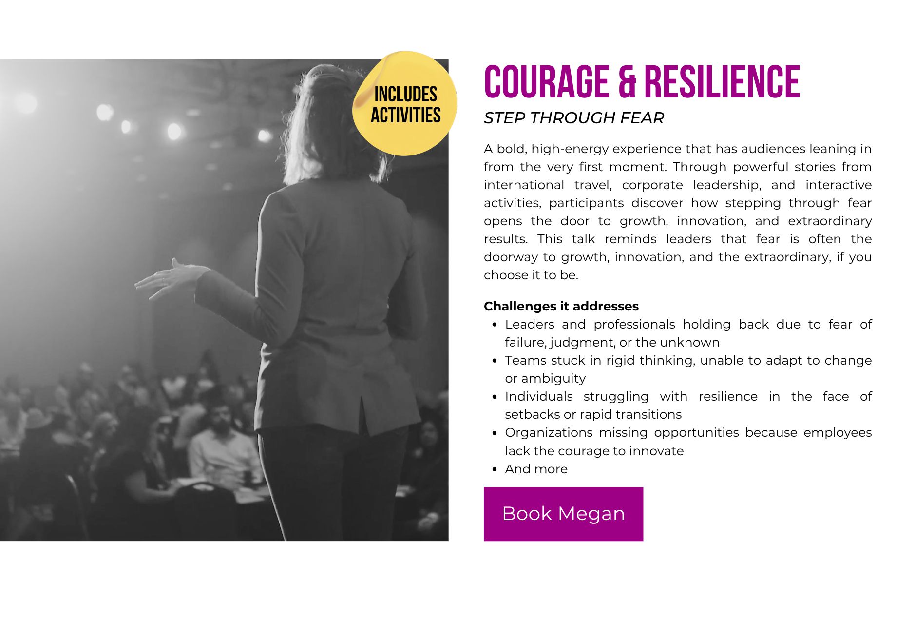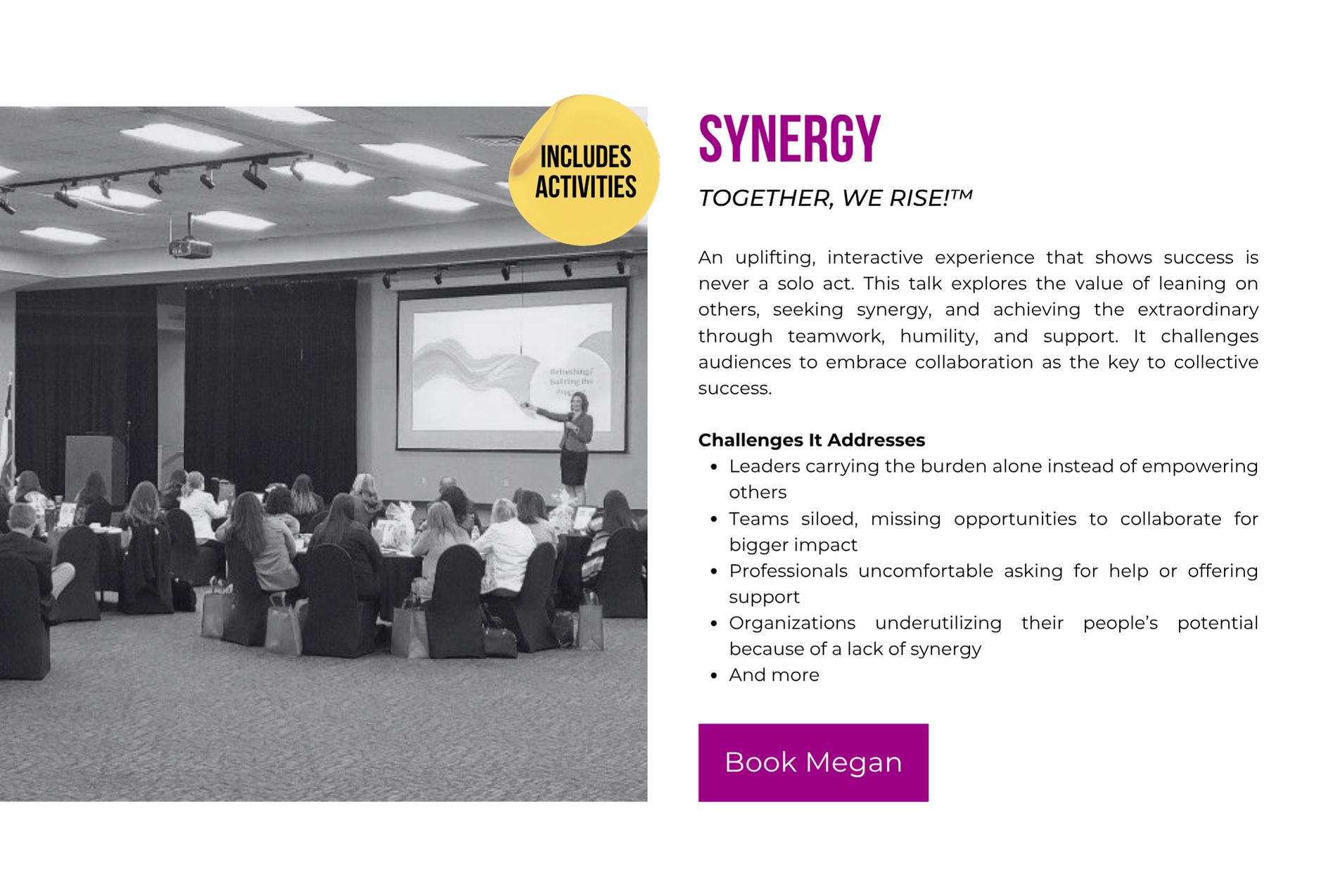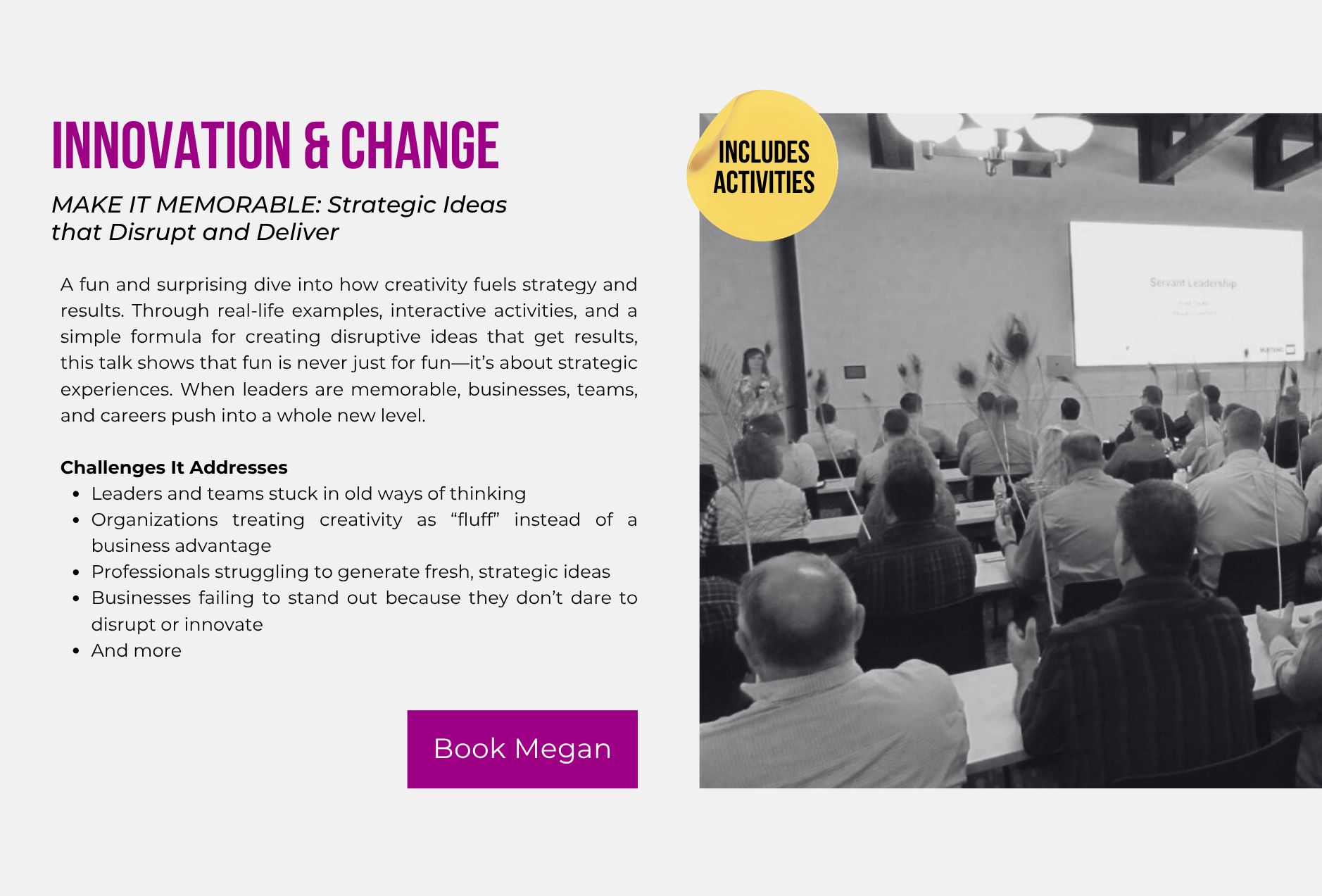Imspiring Leaders Teams Students from 3 different platforms. Serving as a Dynamic Resource. Training Development & Design, Project Management, Coaching & Career Mentoring, Facilitation. Speaking. Events, Conferences Universities Monthly Meetings. Consulting. Everything. A few things. Just one thing (full list provided). Development and Design Training Experiences Experience a full-service training and development solution all in one place - everything from individual training sessions, to full comprehensive training programs. Meet your organization's needs for leaders, teams and students with ease and flexibility. Goal. What problem are we solving for? Topic, what concentration helps us reach your goal? Delivery, what method creates an experience for the topic? Alignment, Attrition, Career Growth, Communication, Conflict, Customer Service, Delegation, Engagement, Influence, Leadership, Networking, Performance & Productivity, Public Speaking, Sales, Self-Awareness, Trust, And more! Everything DiSC (Wiley), Development Programs, Students, Interns, Leaders, Managers, Non-Manager Titles (Supervisors, Team Leads and High Potentials), Teams, International Business, LinkedIn, Situational Leadership II (SL II) by Blanchard, Team Retreats/Workshops, The 5 Behaviors of a Cohesive Team (Wiley), Aha Slides, Amazing Race Style, Breakout Groups, Competitions, Debriefs, Electronic Note Forms, Field Trips, Flip Chart Activities, Gallery Walks, Guest Speakers, Presentations, Scavenger Hunts, Table Trivia, Visual Aids, Whiteboards (virtual). Popular programs. Everything DiSC - Assessments, Wiley Certification Program & Training Programs. Leadership Training. Situational Leadership II (SL II) - Assessment, Blanchard Certifications and Training Programs. The 5 Behaviors of a Cohesive Team - Assessment & Training Program. Project Management Celebrate on-time GO LIVE launches and professionally run Learning & Development projects from start to finish - clean communication, role clarity, team accountability, delegation and weekly report-outs to keep it simple and low stress. Coaching & Career Mentoring. From 1:1 training to select guidance, you expand your career at any level, whether a student, professional or looking for a change in careers. Access top industry tools to discover your best next steps and understand how to continue your journey. Facilitation. Enjoy well-facilitated meetings, workshops and training events, so they run smoothly and have the most effective output and use of time. Speaking Personal stories, humor and experiences from around the world will provide a new perspective for you to go make a change in your life, think about things differently or inspire someone else. Resilience. Servant Leadership. Yes, You Can! Be Different. Never Settle. View Videos. Consulting. All Things L&D. Contact megan. Houston Business Journal 40 Under 40 Award 2023 nominee. Help with everything? Help with a few things? Or, just help with 1 thing? A resource buffet. NEEDS ANALYSIS & NEXT STEPS FOCUS GROUPS, SURVEYS, INTERVIEWS GRAPHIC DESIGN SLIDES, VIDEOS, BANNERS & FLIPBOOKS INSTRUCTIONAL DESIGN COURSE DEVELOPMENT, ACTIVITIES, PARTICIPANT & FACILITATOR GUIDES EXECUTIVE SUMMARIES TRAINING MANAGEMENT & STRATEGIC TRAINING ALIGNMENT DELIVERY TRAINING & FACILITATING METRICS MEASURING PRE/POST COURSE KNOWLEDGE. Let me do what I love to do, so you can get back to doing what you love to do. MEGAN BILLNOSKE. Are you ready? Schedule a free consultation today, and just start a conversation.